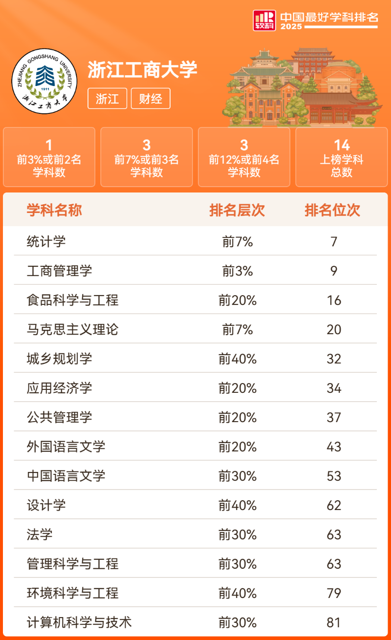 10月15日,高等教育评价专业机构软科正式发布“2025软科中国最好学科排名”,浙江工商大学有14个学科上榜,其中1个学科进入前3%,2个学科进入前7%,共7个学科进入前20%。学校登峰和优势特色学科表现优异,其中工商管理学进入全国前3%,首次入选“中国顶尖学科”;统计学、马克思主义理论学科排名均进入前7%,连续三年入选“中国一流学科”。此外,学校多个学科表现亮眼,应用经济学、食品科学与工程、公共管理学、外国语言文学等学科均进入前20%。法学、计算机科学与技术、管理科学与工程、中国语言文学4个学科进入前30%。与去年相比,全校共有11个学科实现排名进位。